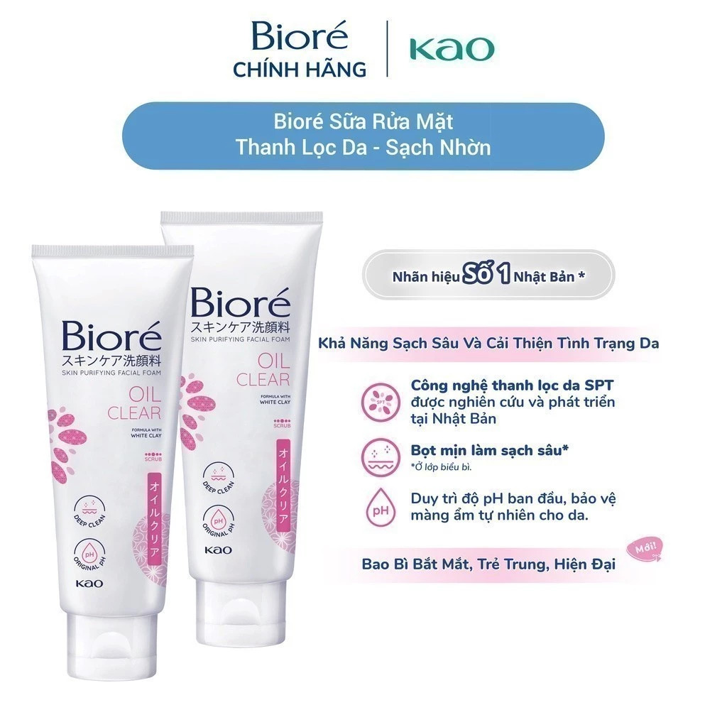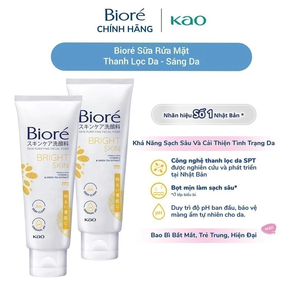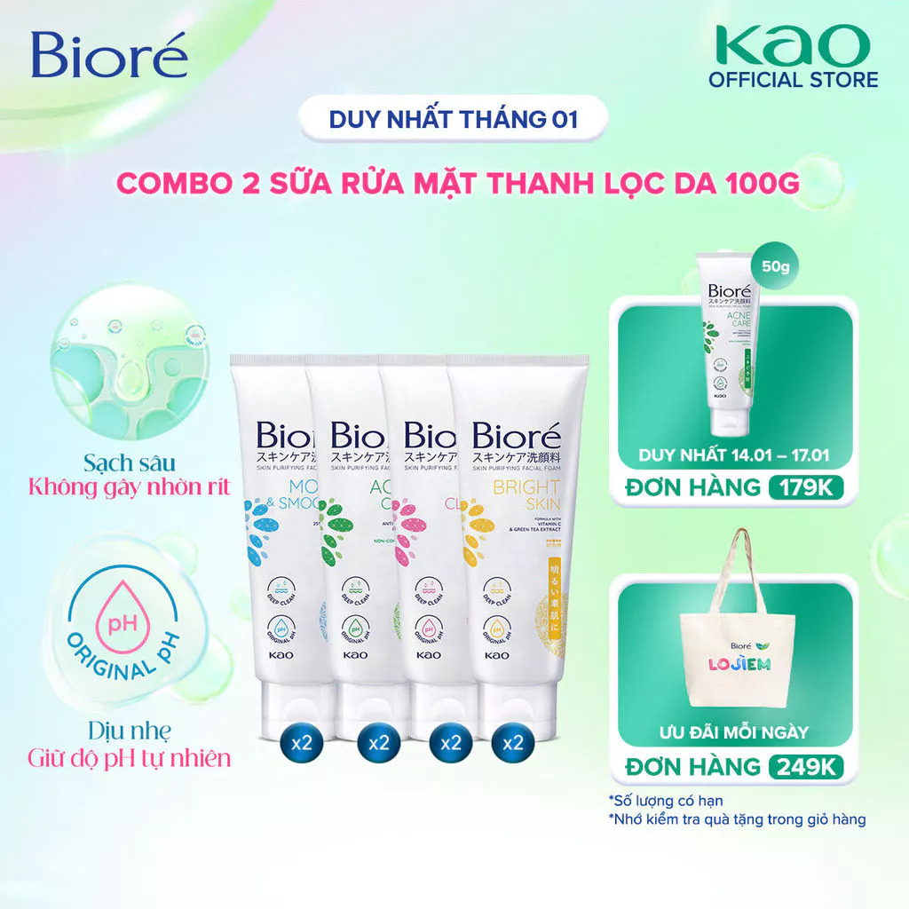 Combo 2 Sữa Rửa Mặt Thanh Lọc Da Biore 100g (Sáng Da/Ngừa Mụn/Sạch Nhờn/Dưỡng Ẩm và Mịn Da)