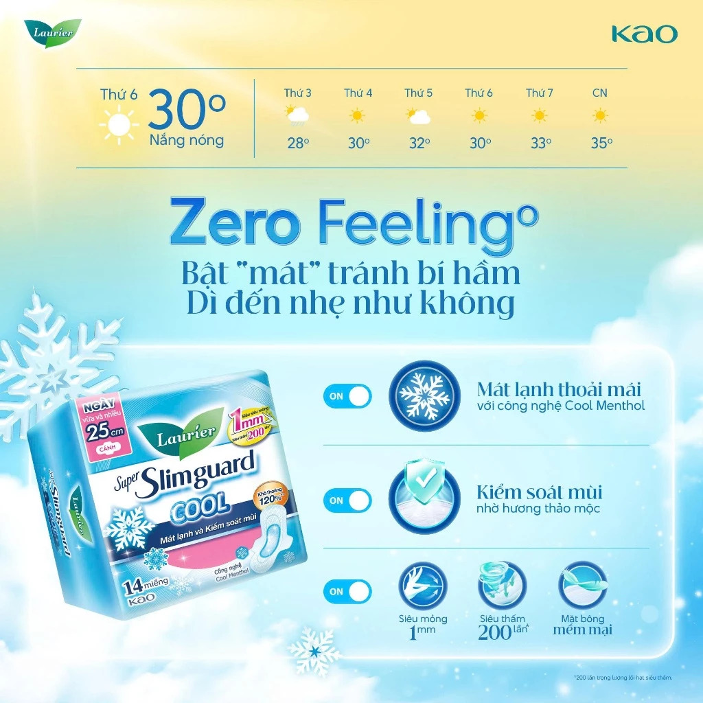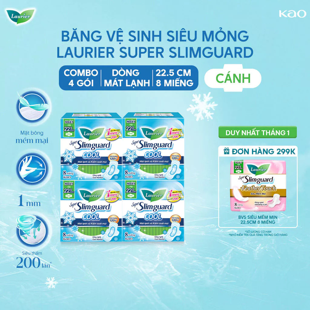 Combo 4 gói BVS Laurier Siêu Mỏng 1mm Mát lạnh 22.5cm 8 miếng