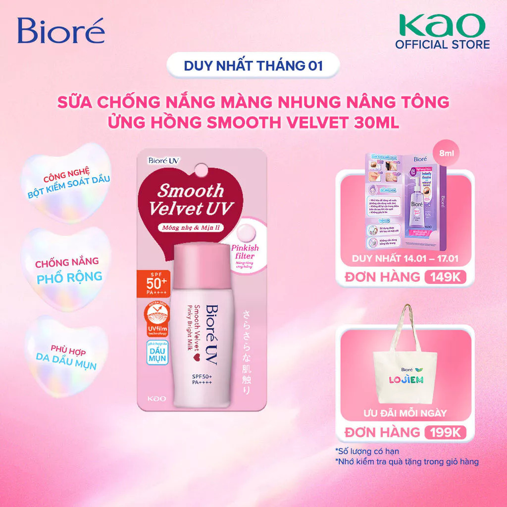 Sữa chống nắng nâng tông Biore UV màng nhung sáng hồng SPF50+ PA++++ 30ml